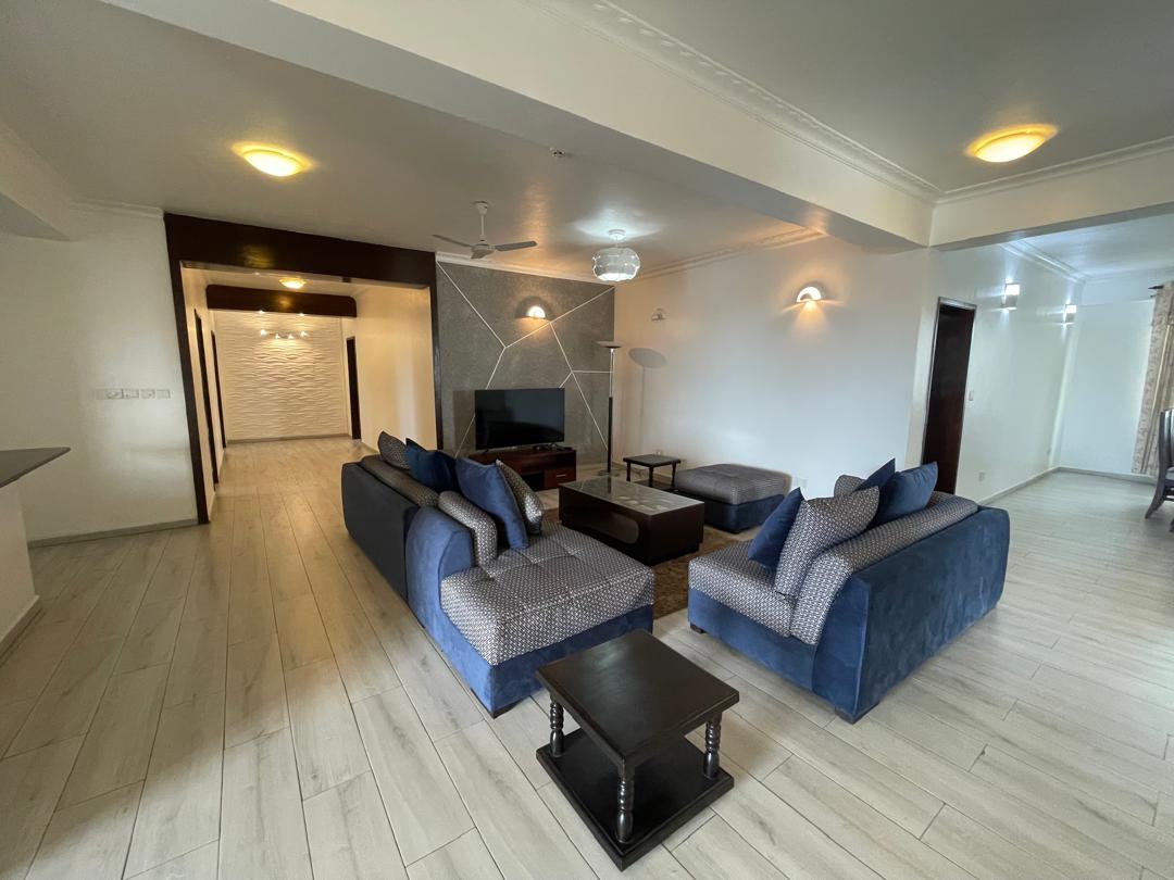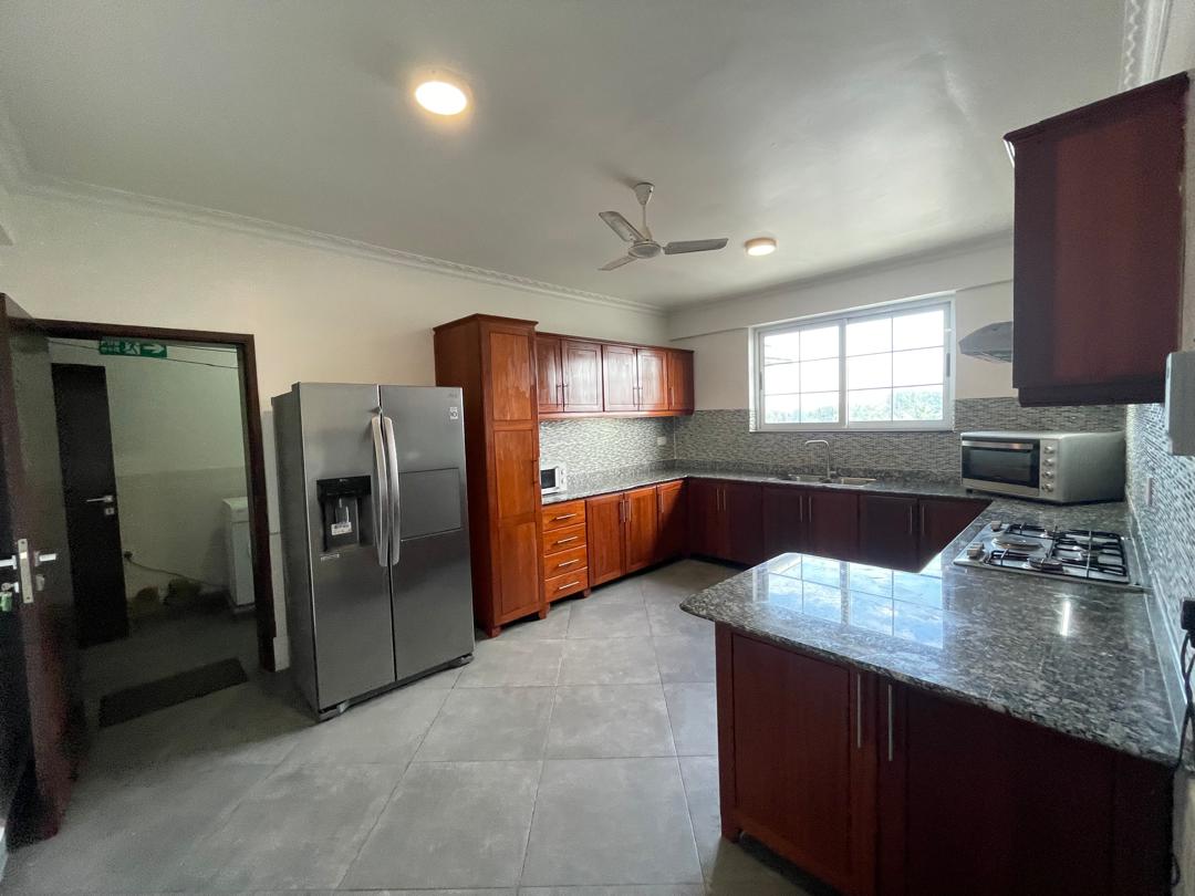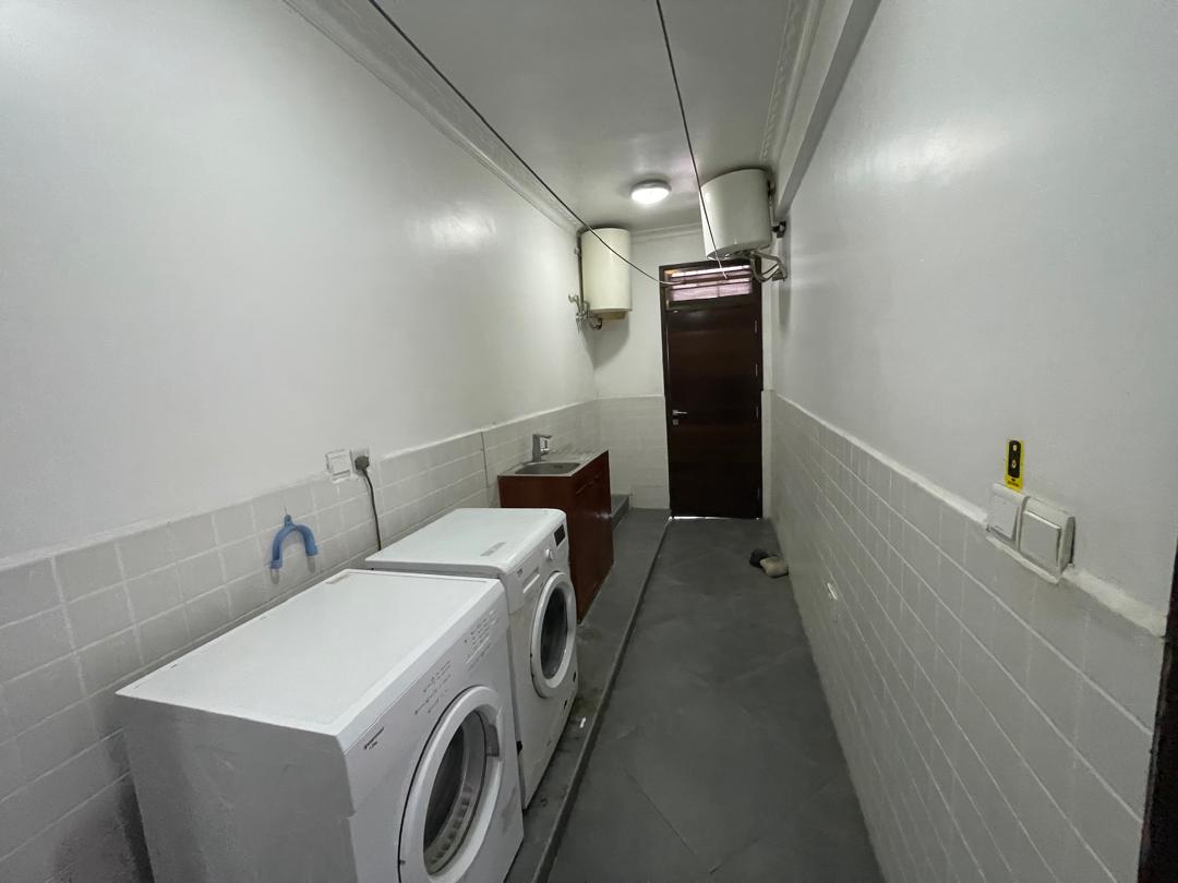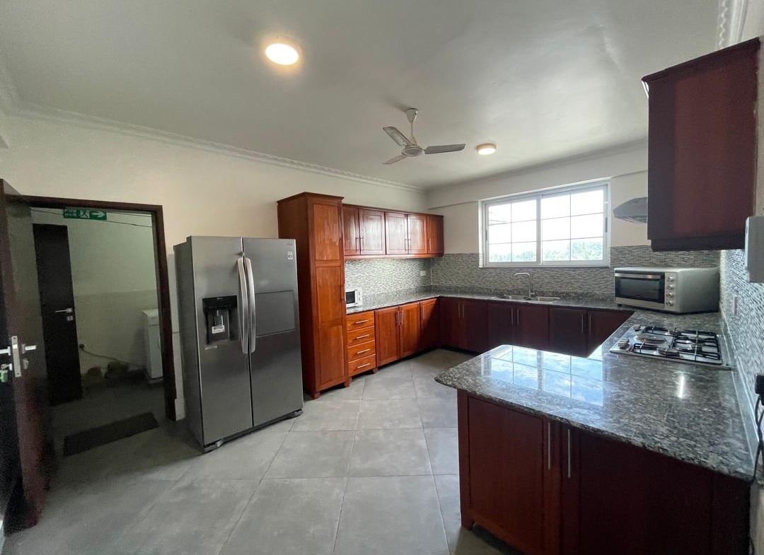 Each of the four executive master bedrooms is en-suite and comes with in-built wardrobes for modern convenience. The apartment is fully air-conditioned and features a bright, spacious living and dining area that opens up to a private balcony with sweeping views of the ocean. The closed, fully fitted kitchen comes equipped with a refrigerator, microwave, and ample storage space, while a dedicated laundry area with washing machines adds everyday practicality.