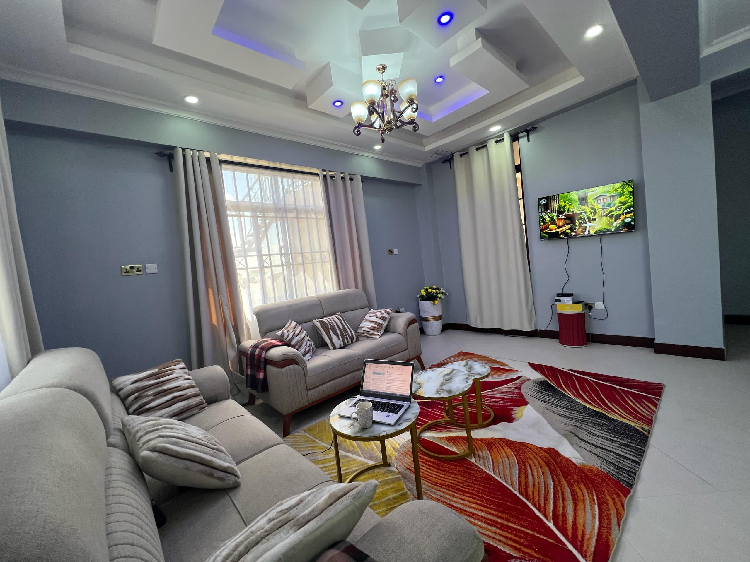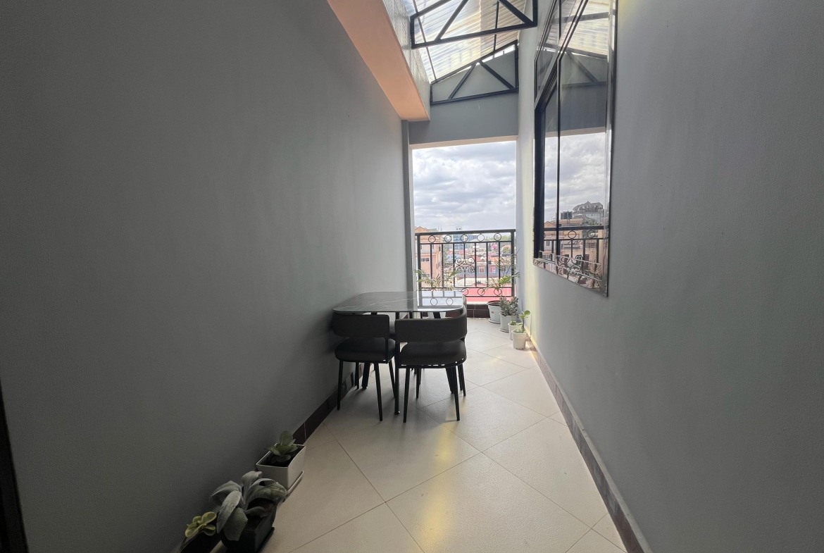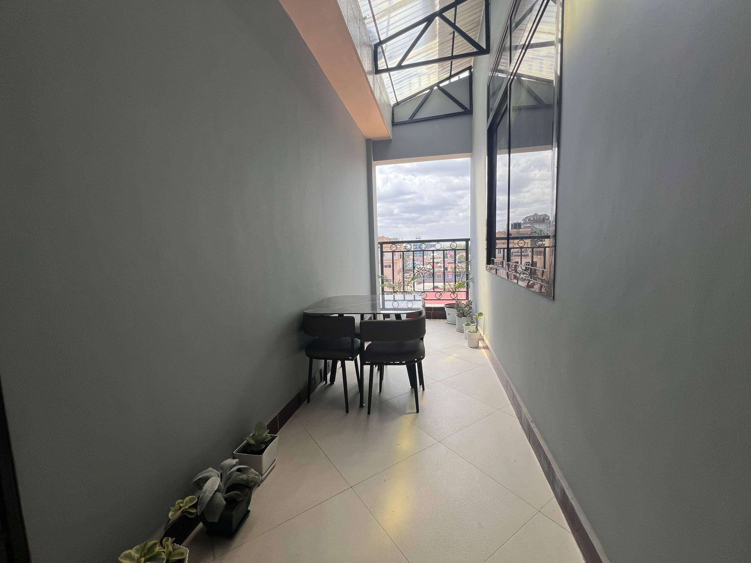 All four bedrooms are en-suite, offering privacy and comfort throughout the home. The apartment features a private balcony and a beautifully arranged outdoor lounge area, perfect for relaxed evenings or entertaining guests. Inside, the lighting is impressively done, highlighting the elegant ceiling decorations, quality finishes, and tasteful furnishings across the living spaces. The kitchen is fully equipped with sleek cabinetry, a refrigerator, and a microwave, and is complemented by a dedicated laundry area and additional storage room. Reliable utilities are ensured with both municipal water and a borehole, alongside Wi-Fi connectivity for modern living.