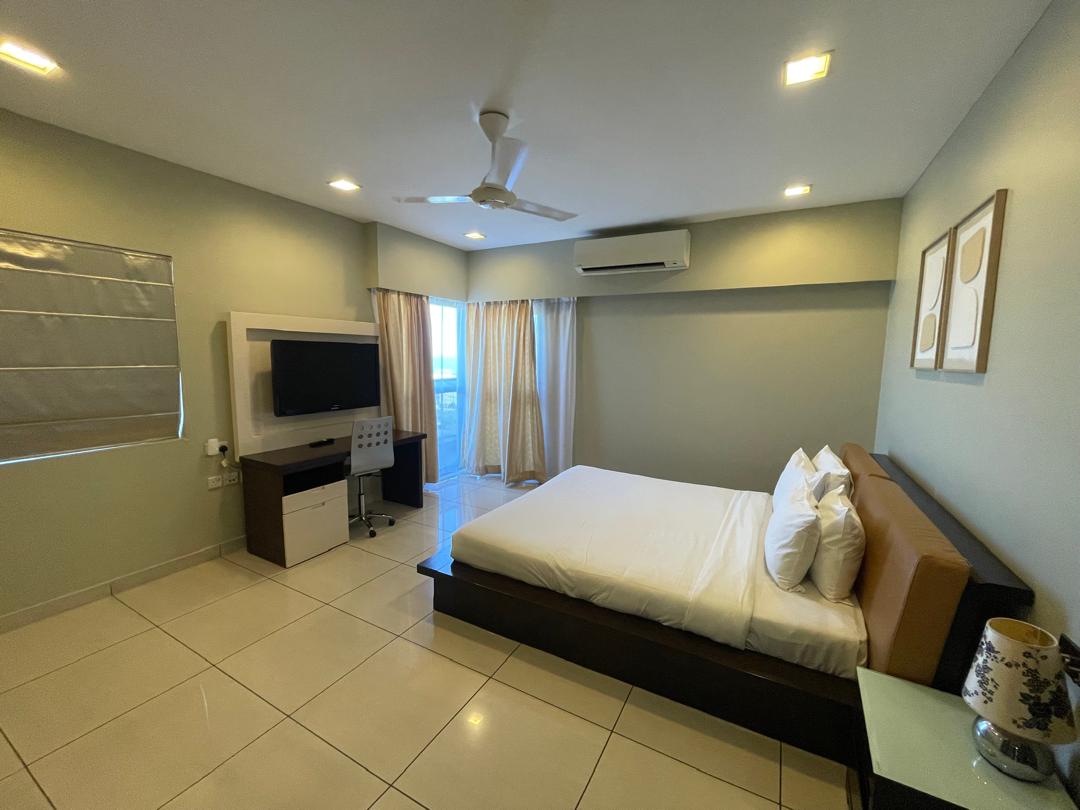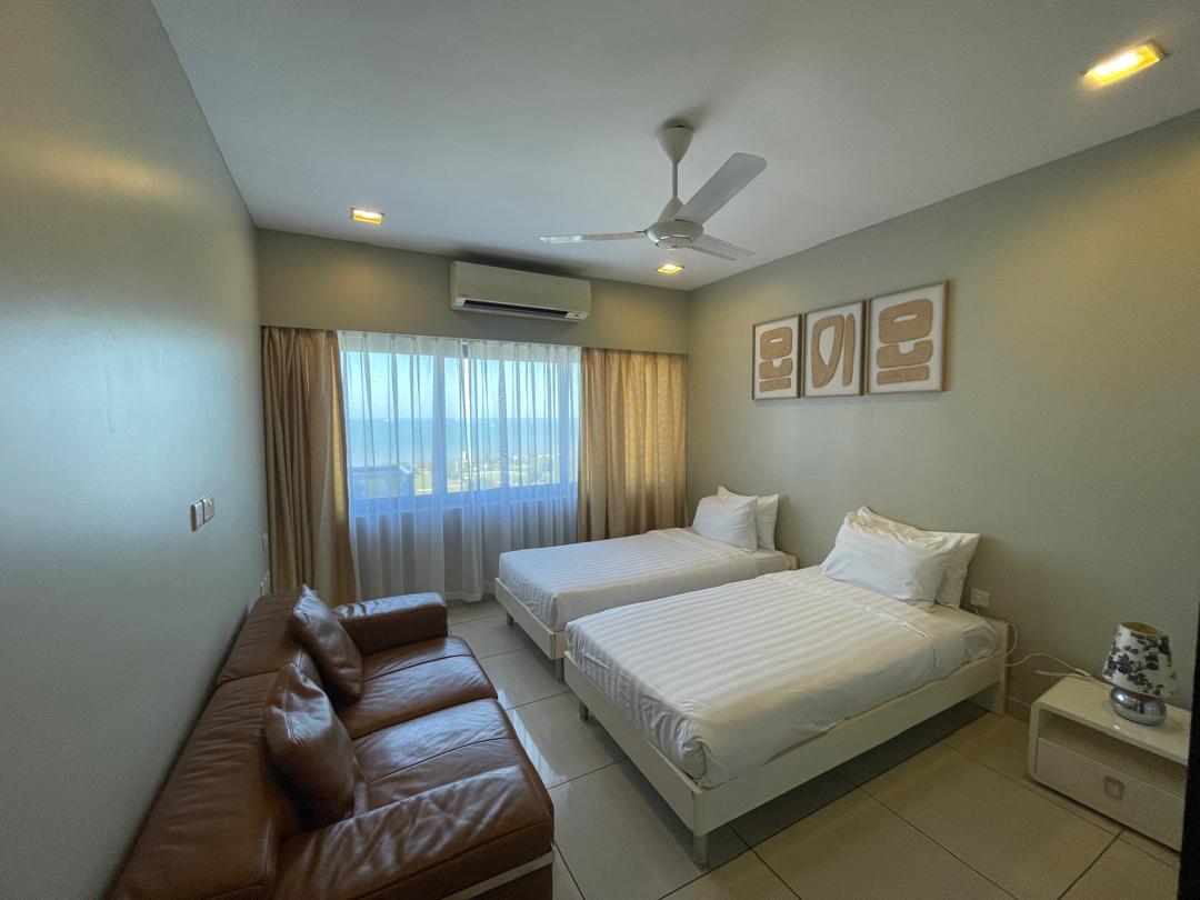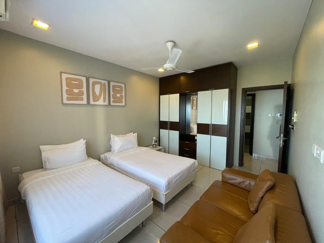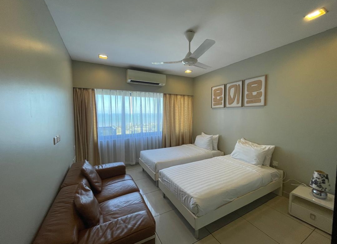 Inside, you’ll find three spacious bedrooms — two of them master suites with private bathrooms — and one standard bedroom ideal for guests or children. One of the rooms features twin beds and a cozy sitting area, while another includes a small desk and chair, perfect for study or remote work. The modern closed kitchen is fully fitted with sleek cabinets, a refrigerator, and a microwave, providing everything you need for effortless meal prep. There’s also a washing machine and a designated ironing area for convenience. The apartment’s interior is enhanced by elegant window coverings, warm lighting, and balconies on both sides, offering refreshing sunrise and sunset views.