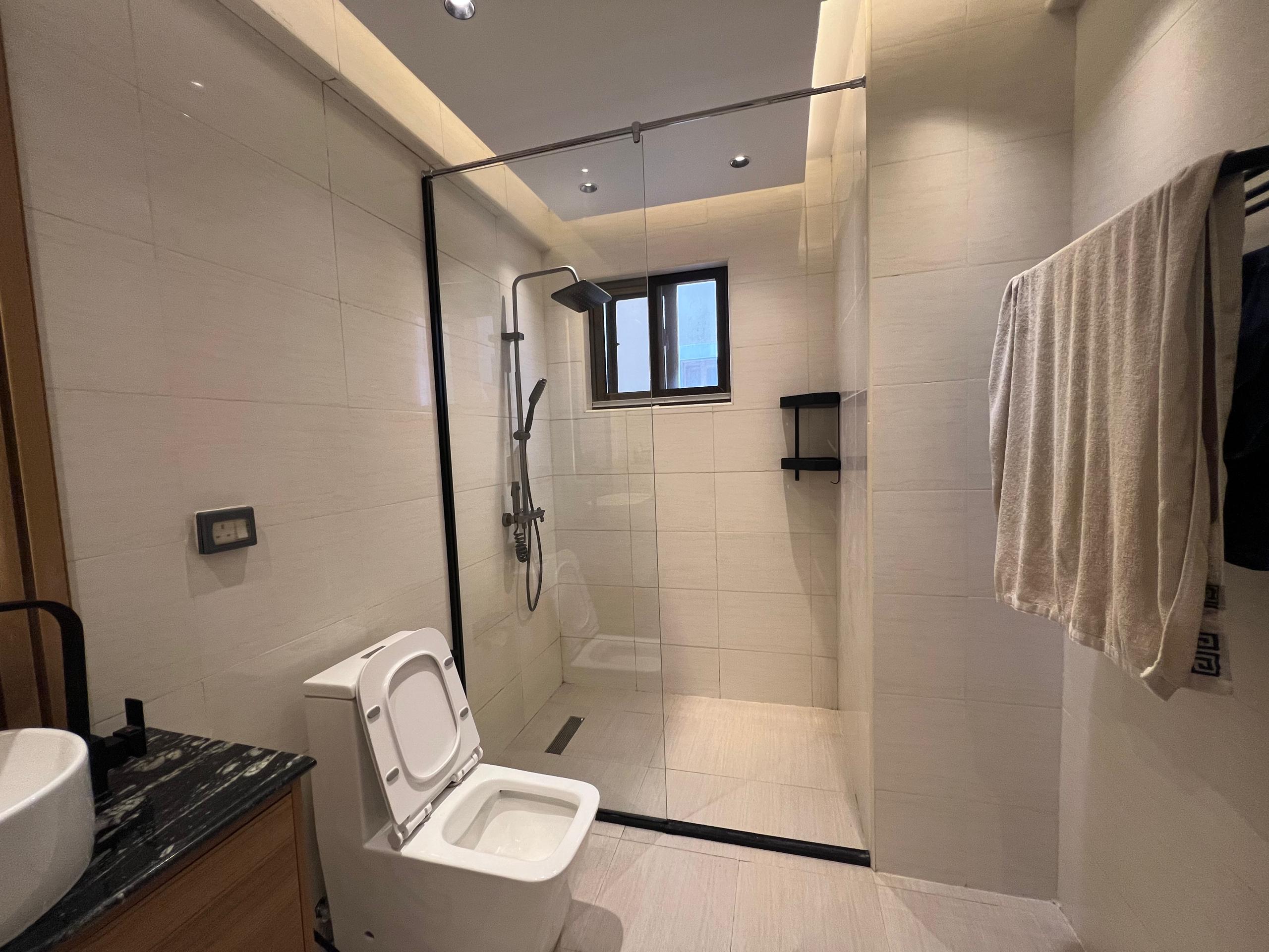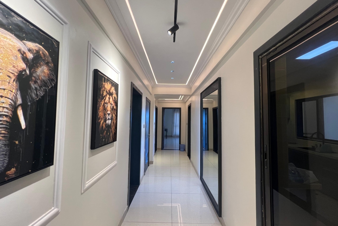 The apartment features three spacious bedrooms, including a master ensuite, each fitted with wardrobes, beautiful wall décor, and window coverings. The bathrooms are neatly finished, complementing the apartment’s elegant style. The living and dining areas are bright and welcoming, enhanced by impressive lighting, tasteful decorations, and a seamless layout perfect for relaxation or entertaining.