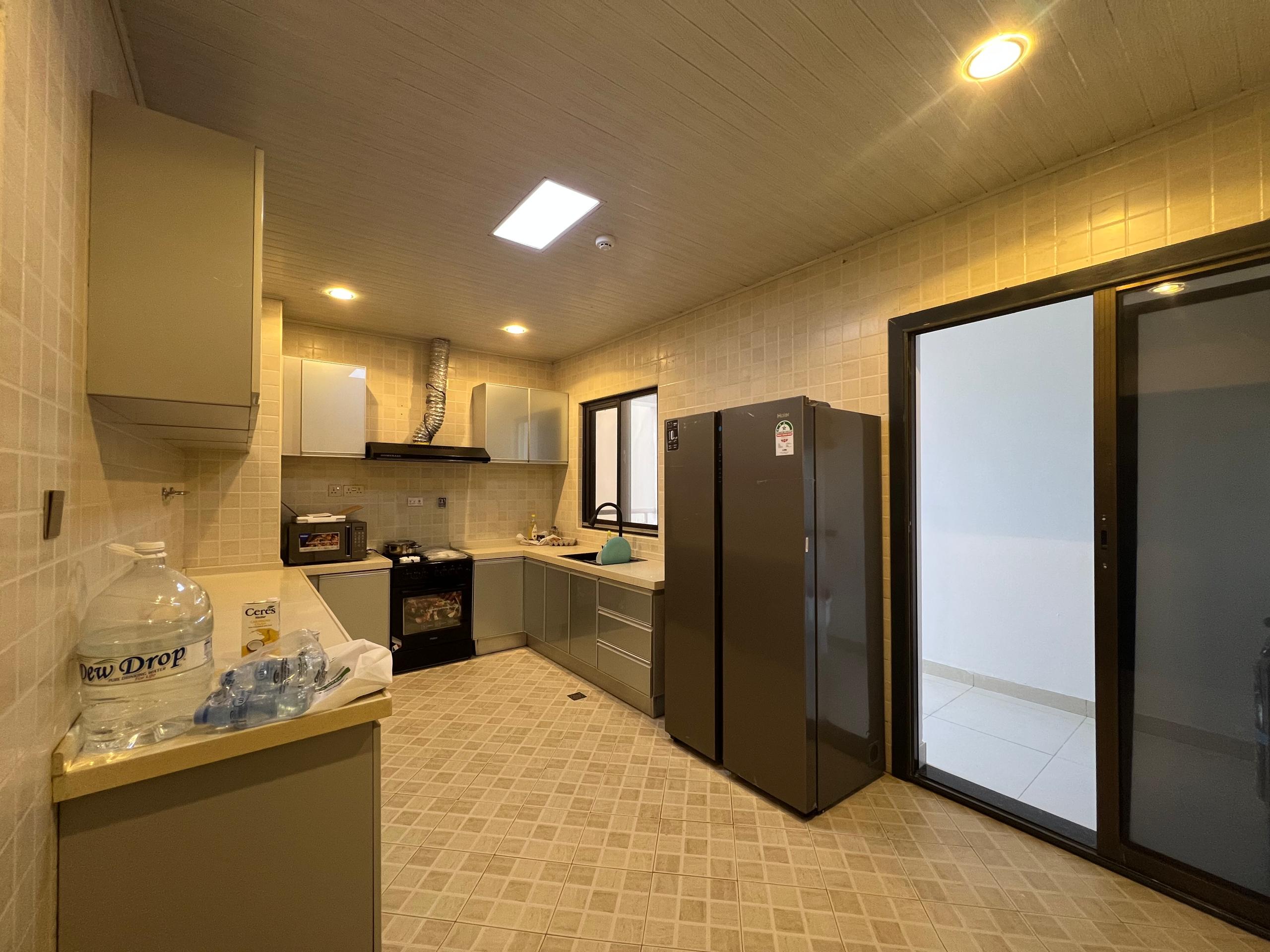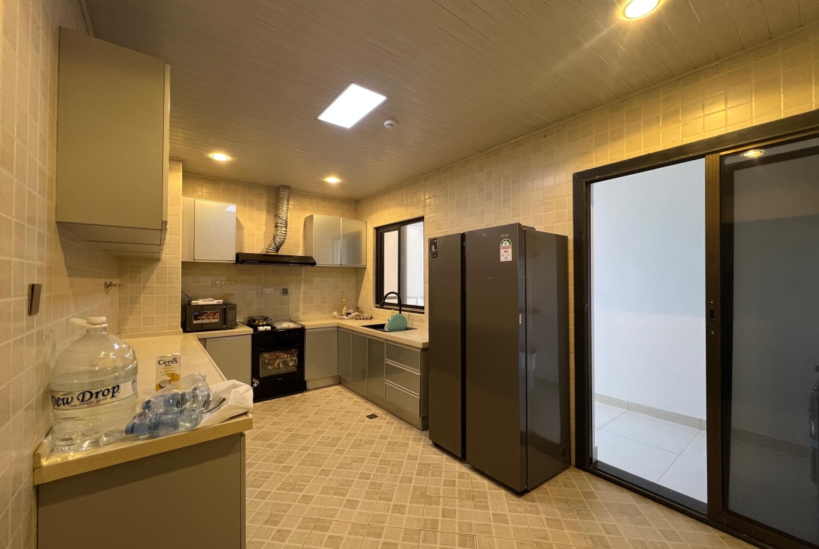 The modern kitchen comes fully equipped with a refrigerator, microwave, and washing machine, designed for convenience and everyday ease. Residents enjoy access to a swimming pool, gym, and beautifully maintained garden. The building is accessed via an elevator, surrounded by a secure concrete wall and offers ample ground parking for residents.