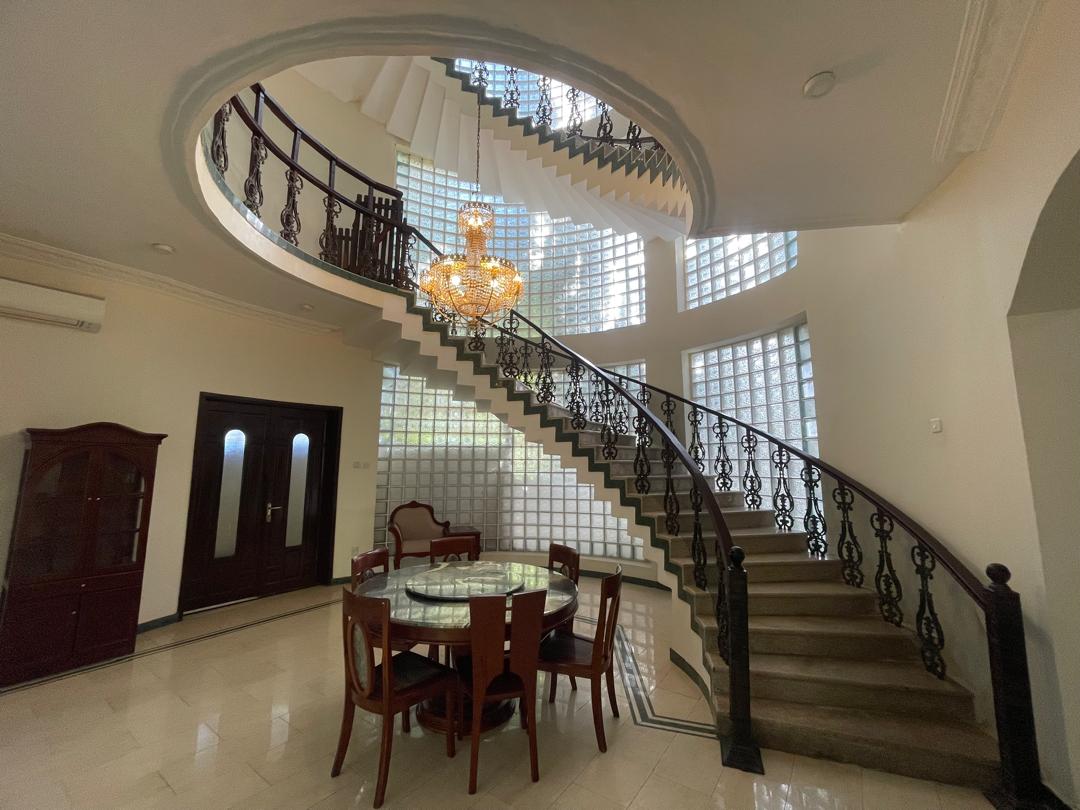 The villa features three spacious en-suite bedrooms, each designed with comfort and privacy in mind. One of the rooms includes twin beds, making it perfect for guests or children. The living and dining areas are warm and inviting, complemented by a closed kitchen with wooden cabinets, a marble countertop, refrigerator, and pantry for extra storage. Other highlights include a beautiful staircase, study area, and balconies on both floors — one with a cozy lounge area overlooking the surroundings.