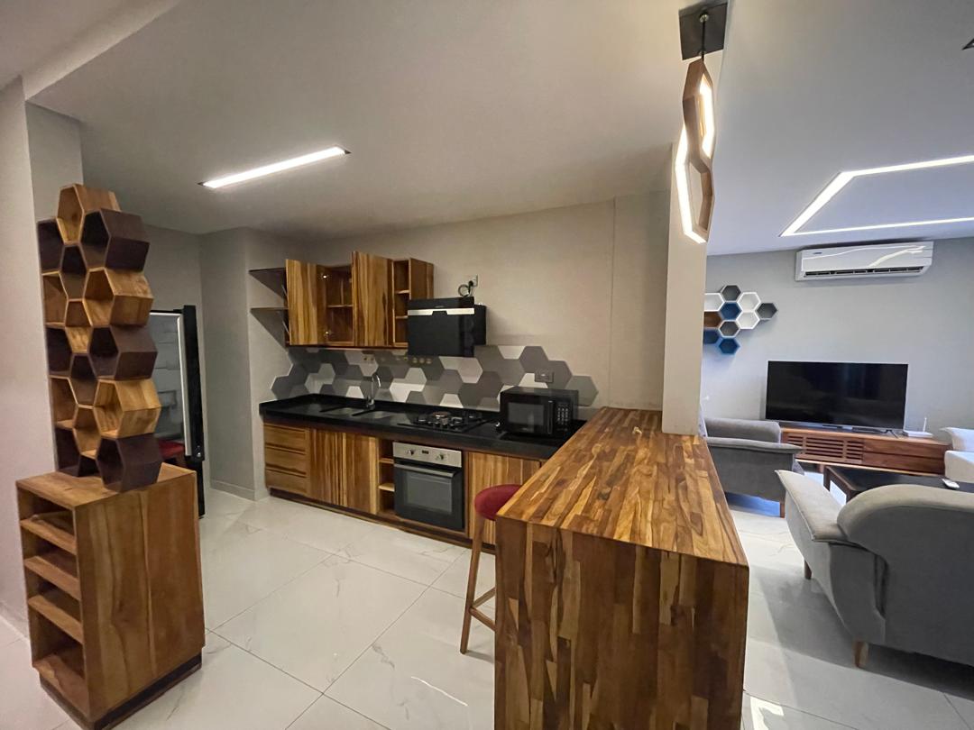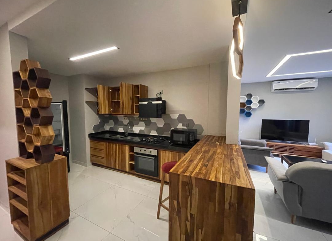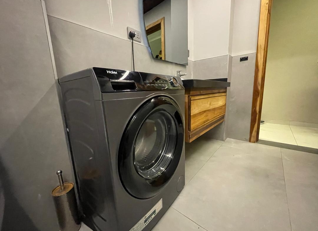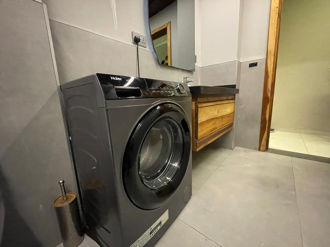 Inside, you’ll find a spacious bedroom complete with an in-built wardrobe and a stylish dressing table, complemented by sleek window coverings that add a touch of charm. The modern open kitchen is finished with exquisite wooden fittings, impressive lighting, and comes fully equipped with a microwave and washing machine. Air conditioning ensures comfort throughout, while the inviting lounge opens to an outdoor sitting area overlooking breathtaking city views. Every corner reflects thoughtful design, from the beautiful wood furniture to the seamless blend of natural light and space.