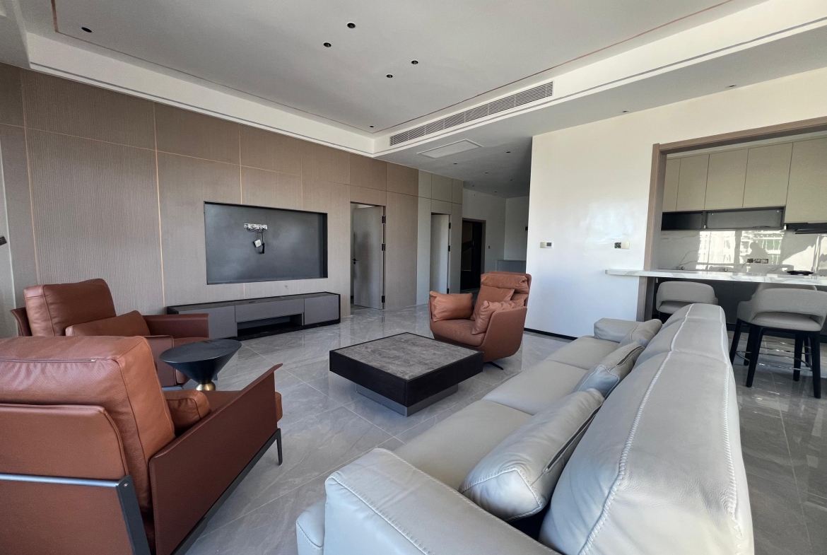 The apartment features three bathrooms, an open-plan kitchen fully equipped with modern appliances, a marble-coated dining area, and a bright, airy living room with large windows overlooking the peaceful neighborhood. The space is beautifully balanced with soft color contrasts, cozy sofas for lounging, and built-in wardrobes in each bedroom. Enjoy the convenience of elevator accessTV cable connectionample parking (2+ spaces), and paved surroundings, plus a swimming pool for leisure and relaxation.