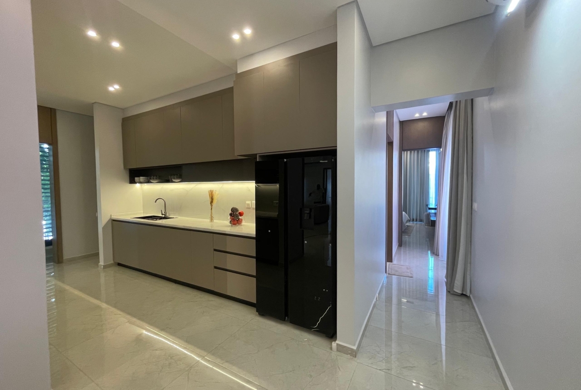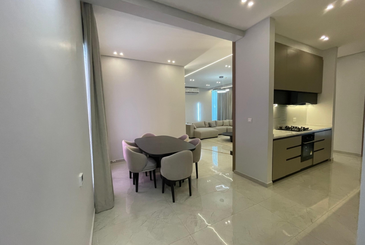 This furnished apartment offers 3 rooms and 3 bathrooms, including 2 master bedrooms with wardrobes, bedside lamps and stylish wall art. One master bedroom comes with its own television, adding comfort and privacy for quiet evenings. The kitchen includes a refrigerator and modern fittings, while all rooms benefit from A/C. A staircase leads you to the higher floor with a private balcony overlooking a charming mix of city and neighborhood views — perfect for fresh air, slow mornings or unwinding at sunset.