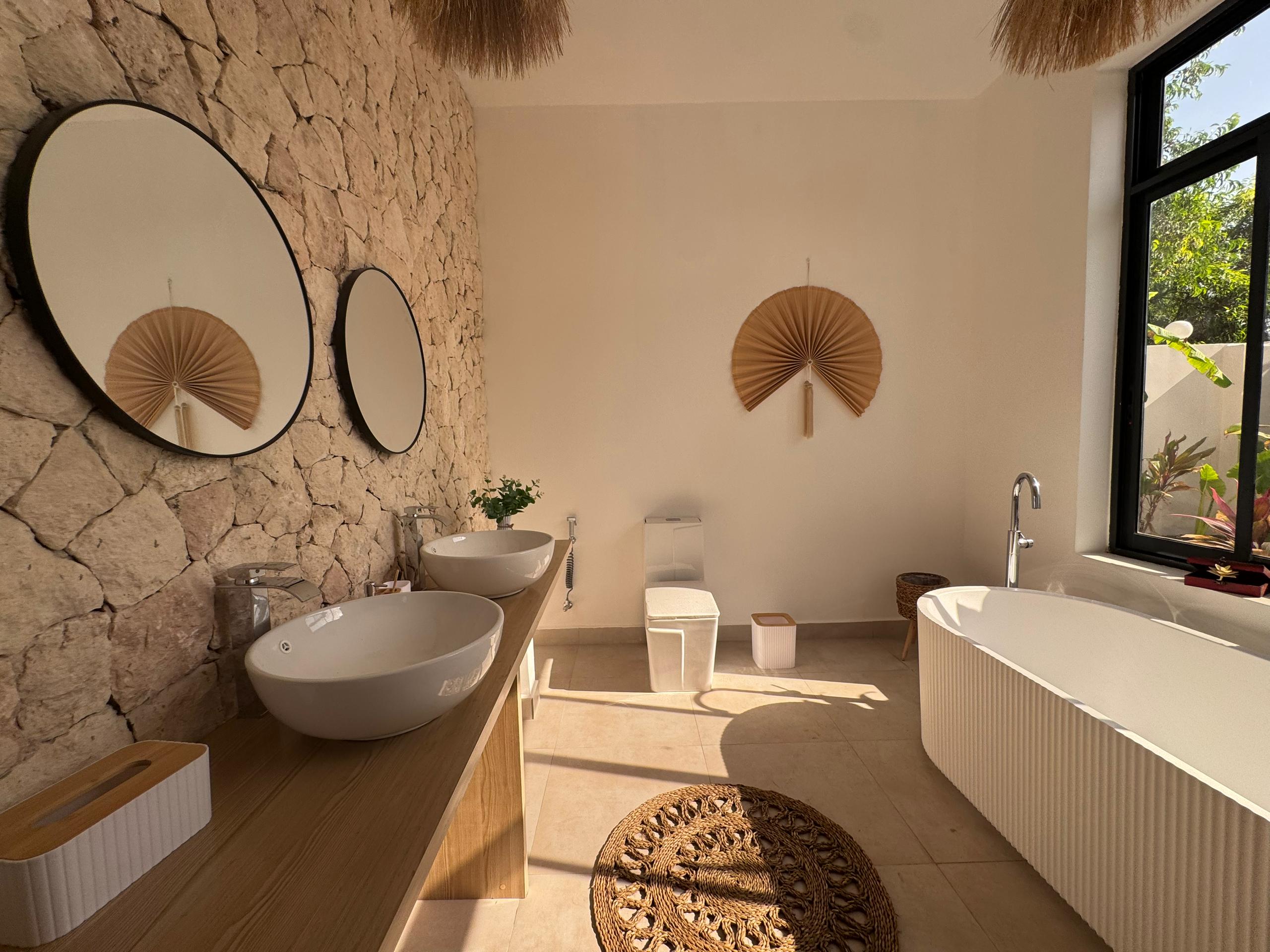 This beautifully designed villa features two spacious bedrooms, two modern bathrooms including a jacuzzi, and an open-plan living and kitchen area. The kitchen comes fully equipped with appliances for comfort and convenience, while the exquisite furniture is handcrafted from natural wood, giving the interiors a unique and elegant touch. Large aluminium windows flood the spaces with natural light, and an indoor swimming pool adds the ultimate touch of luxury for year-round enjoyment.