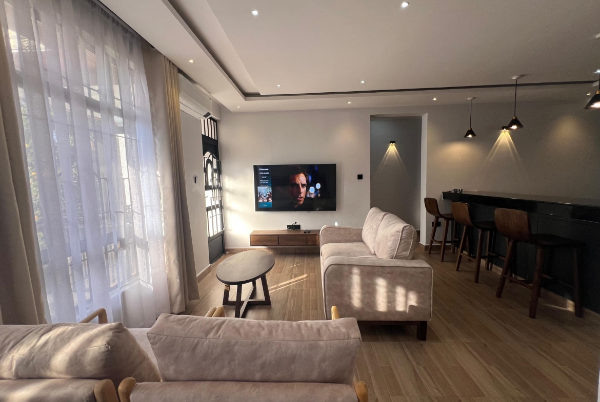Inside, you’ll find exquisite wooden dining furniture and matching kitchen cabinets that create a cozy, grounded atmosphere. The apartment’s design is thoughtfully balanced with warm lighting, elegant window coverings, and furnishings that complement the flooring and decor throughout. The bedrooms are spacious and spotless, offering plush bedding for restful sleep, while the living area provides a comfortable spot to unwind, chat, or enjoy a quiet evening indoors. A lush private garden welcomes you at the entrance — perfect for your morning coffee or afternoon relaxation. You’ll also find a small coffee station, a peaceful balcony with scenic views of Moshono, and additional sofa beds available upon request for extra guests.