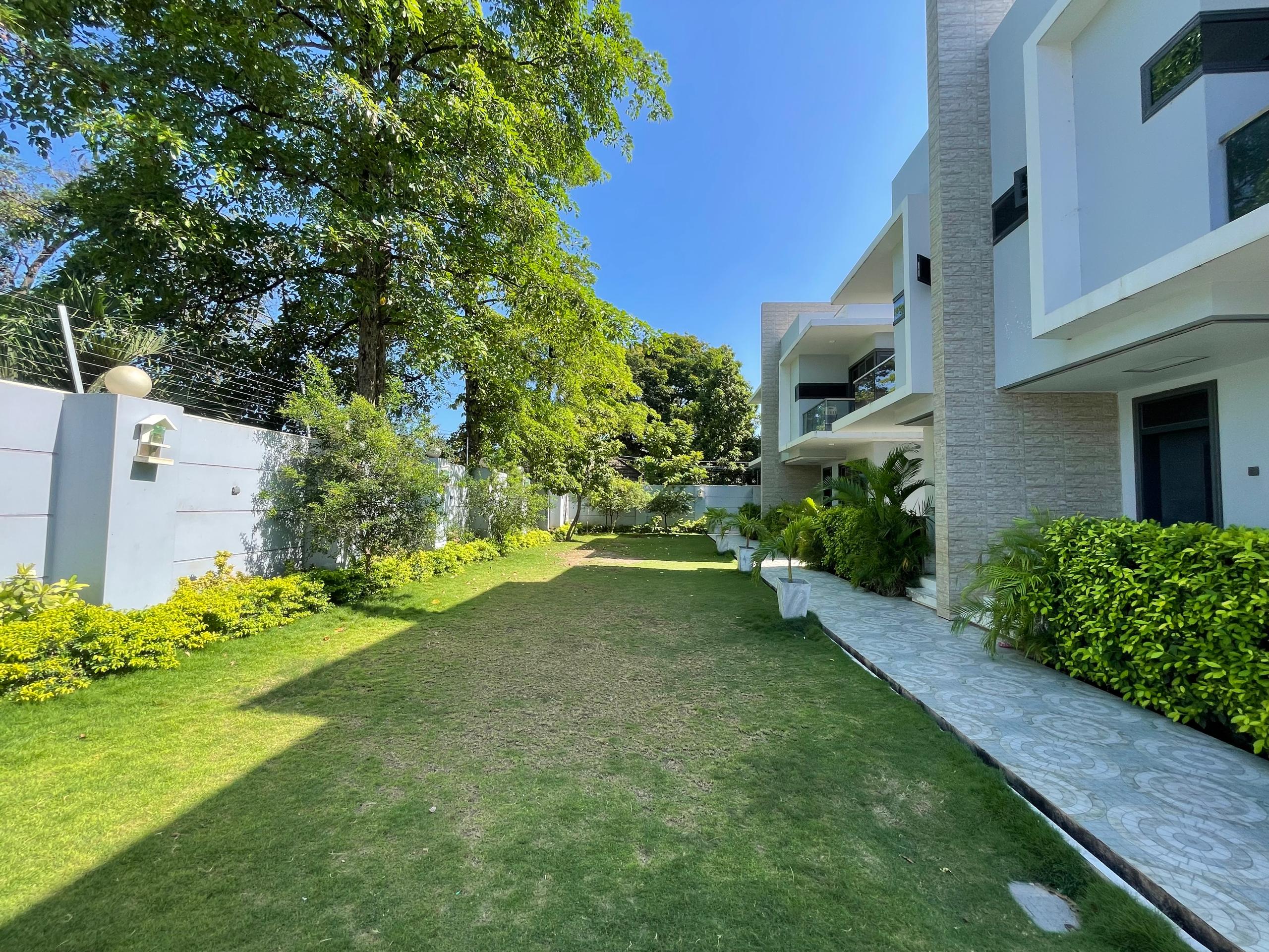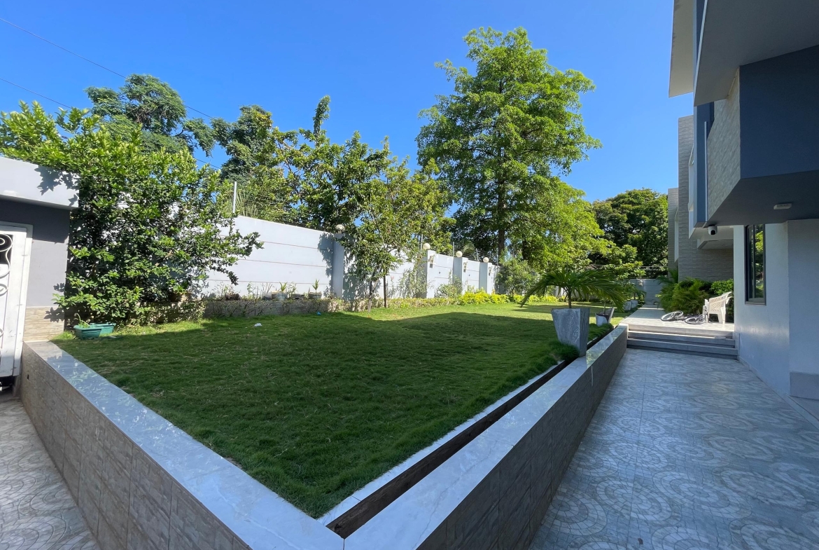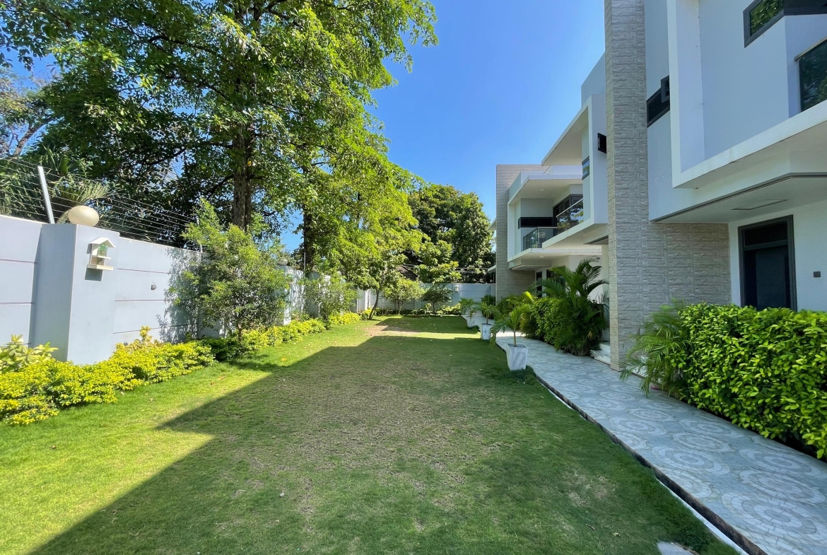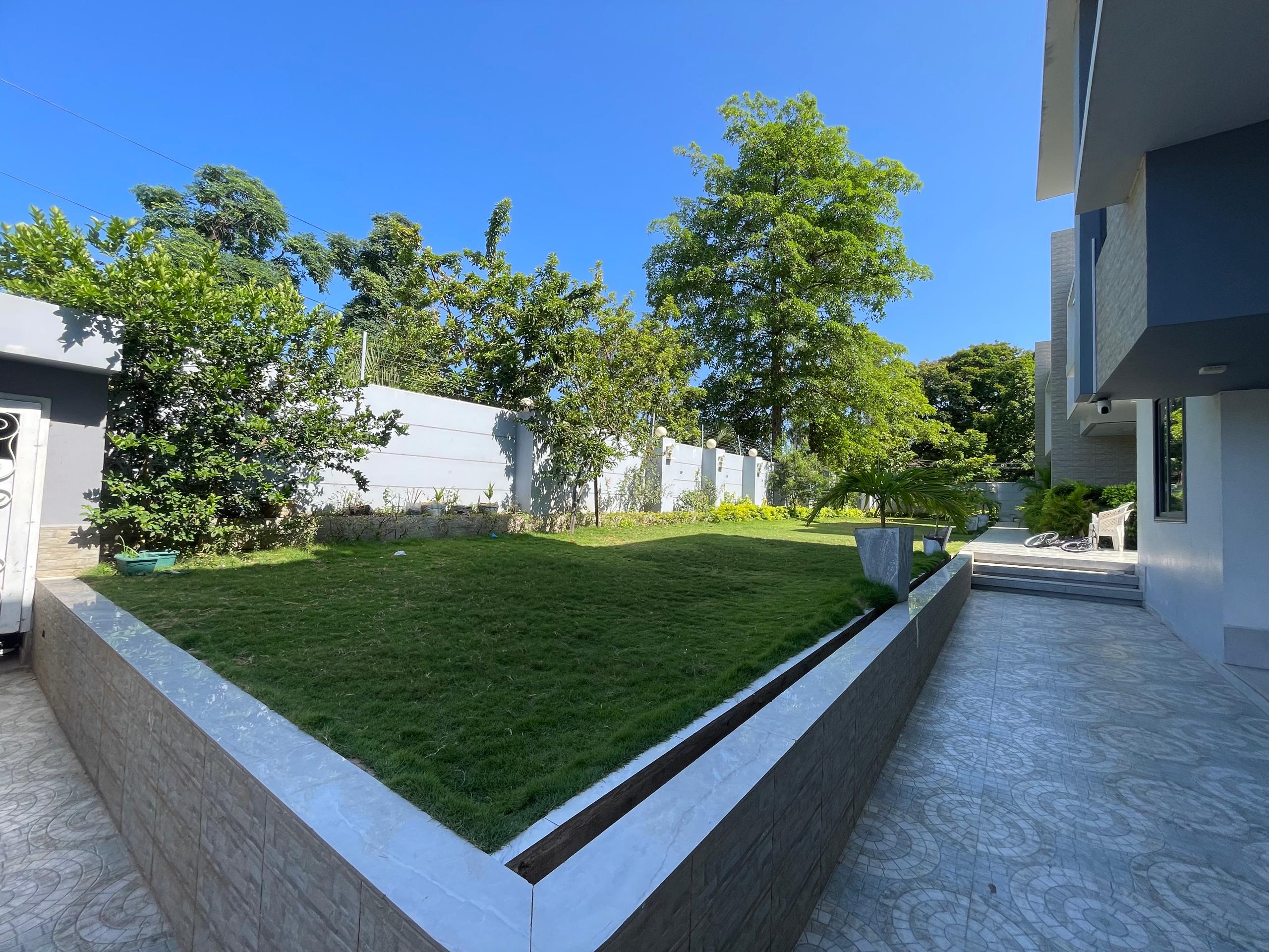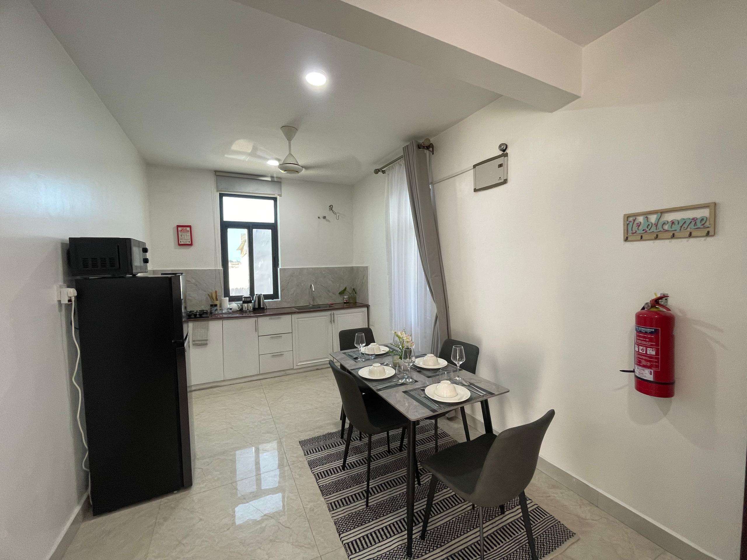 The apartment features one master bedroom, two bathrooms, and an open-plan kitchen equipped with modern appliances including a refrigerator and microwave. The living and dining areas are beautifully furnished, complemented by tasteful wall décor and paintings. Window coverings, air conditioning, and a functional laundry area enhance daily living, while the balcony and outdoor garden provide an ideal setting for barbecues, casual gatherings, or simply relaxing amidst greenery.