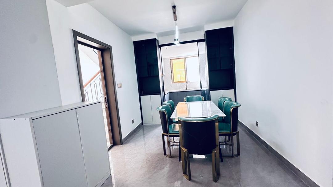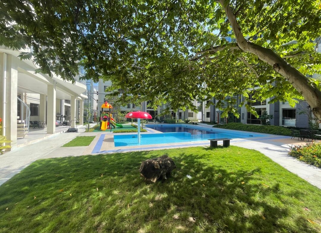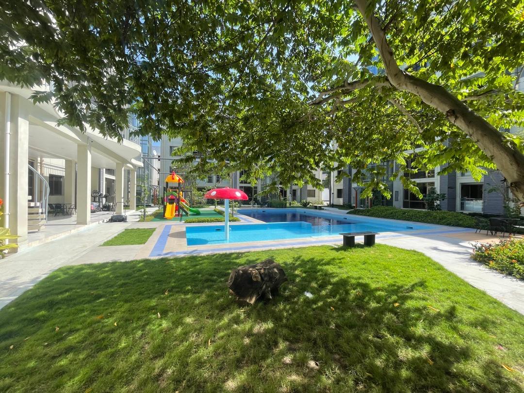 The apartment features three spacious bedrooms, including two master suites with en-suite bathrooms, and one standard bedroom. The open-plan kitchen is fully equipped and thoughtfully laid out for effortless cooking and entertaining, while the bright living and dining areas create airy, inviting spaces for relaxation or hosting guests. Additional conveniences include a swimming pool, fully-equipped gym, landscaped garden, 24/7 security, elevator access, ample parking, a private balcony, paved walkways, and a dedicated laundry area — all crafted to elevate your living experience.